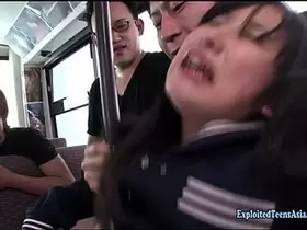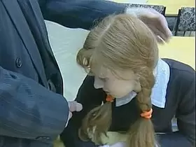 Two naughty schoolgirls give a hard blowjob on the back of the bus
